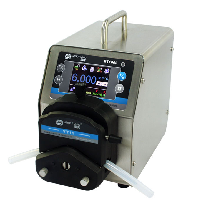 BT100L流量型智能蠕動泵流量范圍0.00011~720毫升/分鐘。采用彩色液晶和觸摸屏技術(shù),操作界面簡單,直觀,明了。主要適用于精準(zhǔn)流量傳輸控制,用戶可以根據(jù)自己的需要流量顯示,流量控制,流量累計(jì)。同時本產(chǎn)品實(shí)現(xiàn)了重復(fù)定時定量傳輸。適用于精確計(jì)量和定量給料,精度*高可達(dá)0.5%,為了減小不必要的蠕動泵噪音,采用了智能溫控技術(shù)。在RS485通訊中,因?yàn)椴捎昧薓ODBUS協(xié)議,更易于與其他控制設(shè)備如計(jì)算機(jī),人機(jī)界面,PLC等連接。