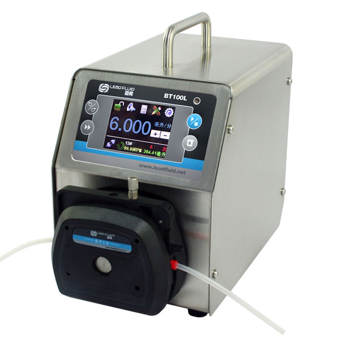 BT100L流量型智能蠕動泵流量范圍0.00011~720毫升/分鐘。采用彩色液晶和觸摸屏技術(shù),操作界面簡單,直觀,明了。主要適用于精準(zhǔn)流量傳輸控制,用戶可以根據(jù)自己的需要流量顯示,流量控制,流量累計(jì)。同時本產(chǎn)品實(shí)現(xiàn)了重復(fù)定時定量傳輸。適用于精確計(jì)量和定量給料,精度*高可達(dá)0.5%,為了減小不必要的蠕動泵噪音,采用了智能溫控技術(shù)。在RS485通訊中,因?yàn)椴捎昧薓ODBUS協(xié)議,更易于與其他控制設(shè)備如計(jì)算機(jī),人機(jī)界面,PLC等連接。